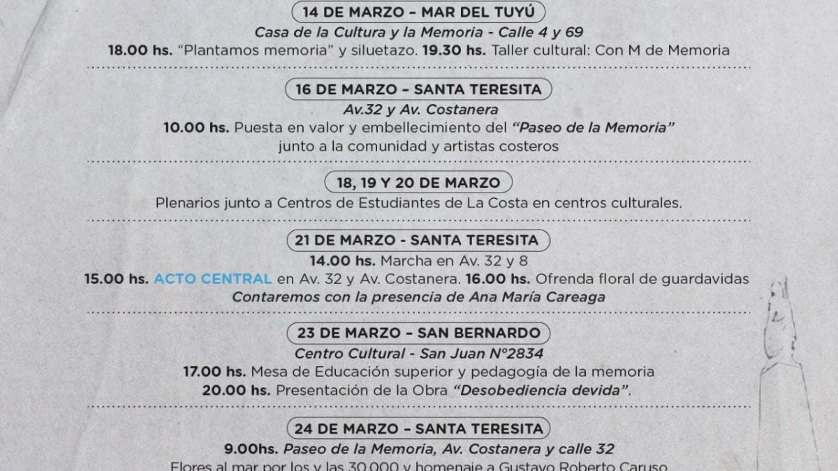 Las actividades impulsadas por la Municipalidad de La Costa en el Mes de la Memoria ya están en marcha. El programa prevé el desarrollo de propuestas en distintas localidades hasta el 24 de marzo inclusive.